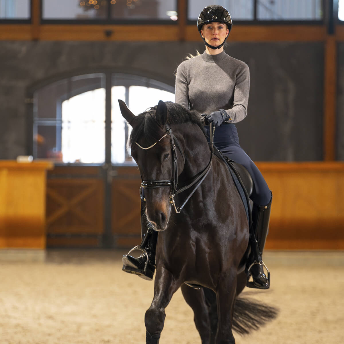 CATAGO Ava Mohair ridebluse er en højhalset bluse i mohairblanding. Den har rib og perleknapper ved ærmerne for et feminint touch. Der er et logo i imiteret læder foldet omkring kanten. Formen er tætsiddende.