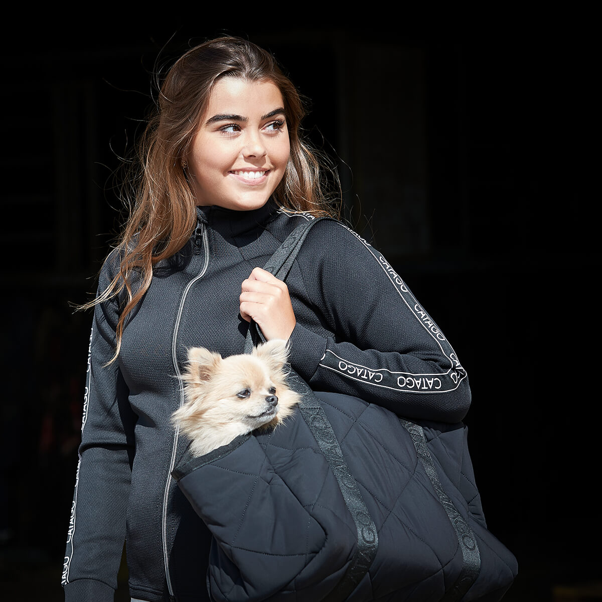 Lækker cardigan fra CATAGO. Riona er en langærmet lynlåstrøje i enkel og sporty trøje med mange fede detaljer. Blusen har to lynlåslommer og lynlås foran der går helt op i den lille opretstående krave. Pyntet med logo bånd fra skuldrene og hele vejen ned af ærmet og printet logo i nakken. Feminint snit med flere syninger der giver et let taljeret snit og raglanærmer. Flot mønster i stoffet giver et lidt ekstra til dit look.